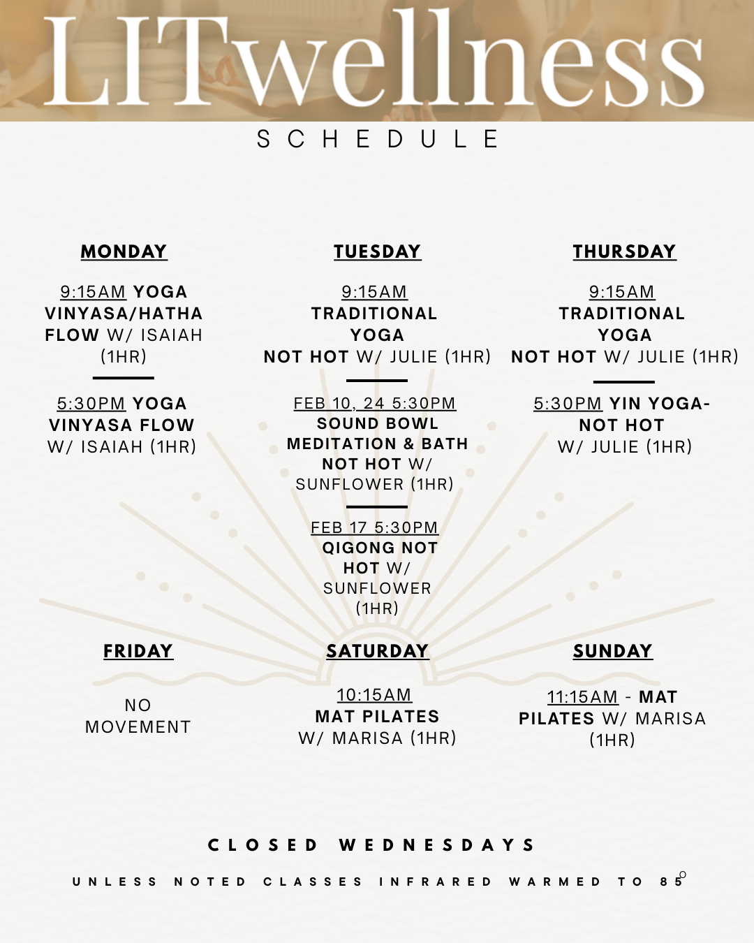 All LITwellness classes or Sound Baths are only $15 for all of February!